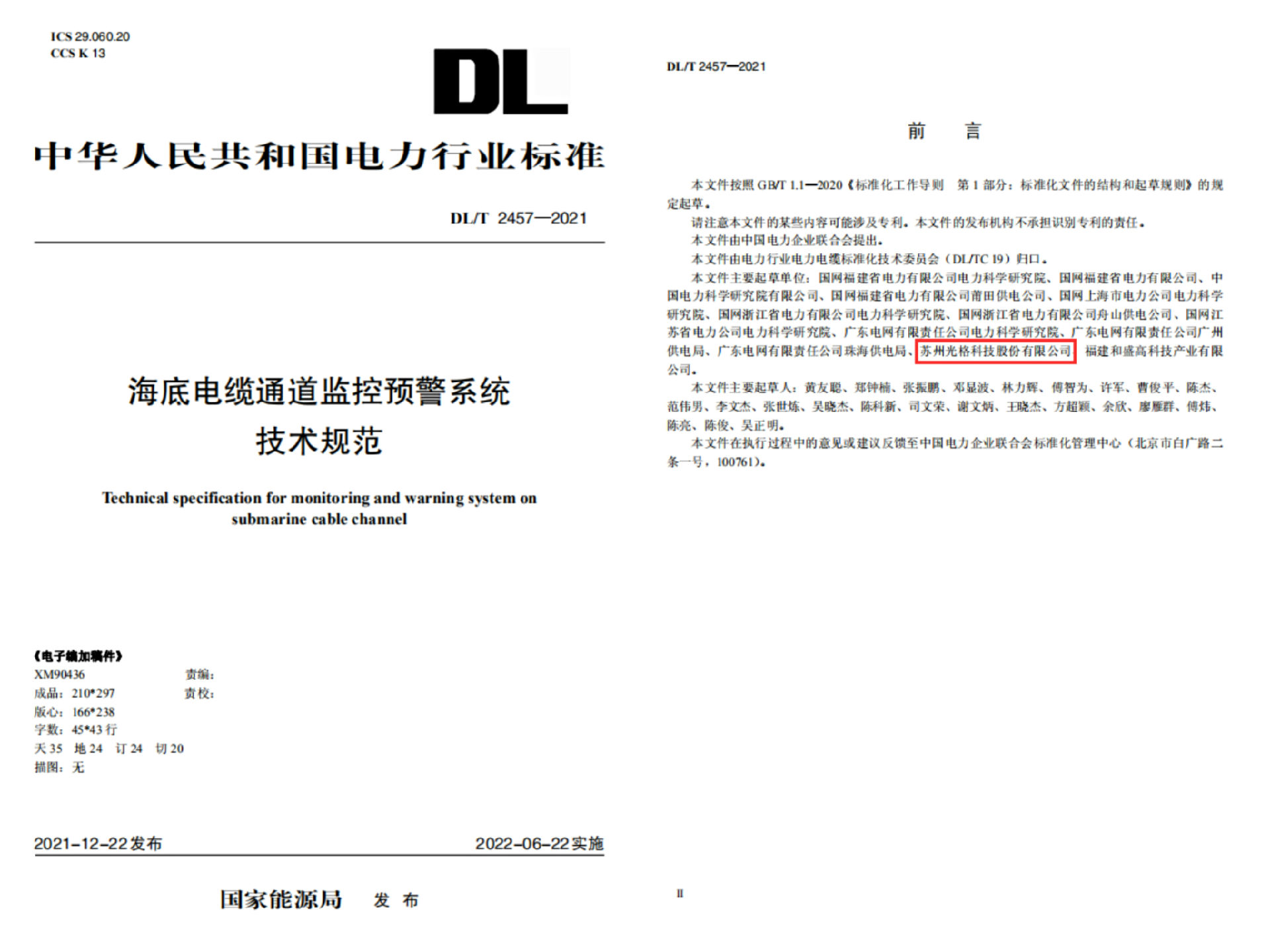 光格科技堅持自主研發(fā)、持續創(chuàng )新的理念,積極推進(jìn)行業(yè)技術(shù)的發(fā)展趨勢,重點(diǎn)參與制定國家能源發(fā)布的《DL/T 2457-2021 海底電纜通道監控預警系統技術(shù)規范》行業(yè)標準,持續為海上風(fēng)電安全事業(yè)貢獻前沿科技,為祖國建設成為海洋強國和能源強國貢獻一份力量。