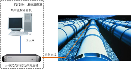 油氣管道防盜監測系統主要由分布式光纖擾動(dòng)探測主機及相應的探測光纜組成,對管道的周邊擾動(dòng)信號進(jìn)行連續線(xiàn)型實(shí)時(shí)在線(xiàn)監測,從而監測管道是否有破壞活動(dòng)發(fā)生。整套監測系統通過(guò)其擾動(dòng)探測主機通訊接口或干接點(diǎn)繼電器端子與管道SCADA系統相連,并負責向其提供報警信息及運行和故障信號。系統能準確定位事故地點(diǎn),快速識別制止事故發(fā)生,確保管線(xiàn)運行安全。